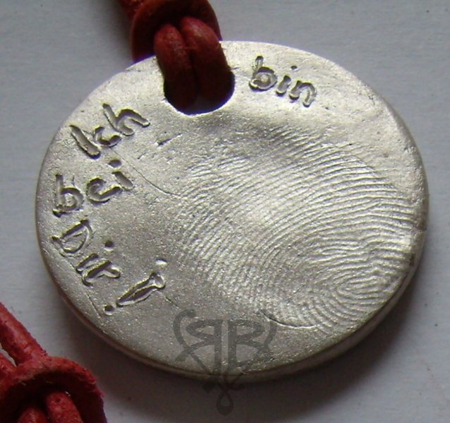 Hier können Sie es in reinem Silber schreiben, auf die Rückseite eines dekorativen, individuell gestalteten Anhängers oder Schlüsselanhängers. Oder auch auf die Vorderseite?