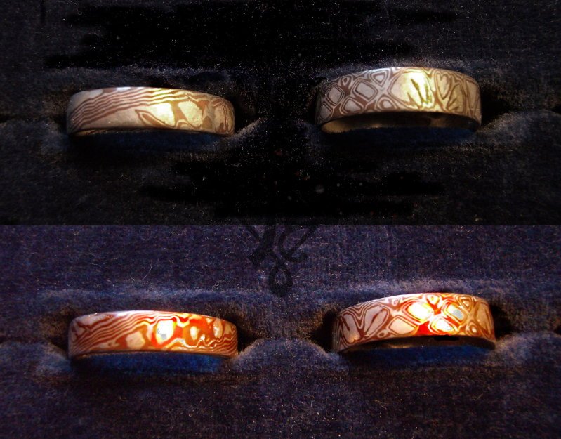 Entwickelt wurde diese Technik zuerst in Japan. Ähnlich wie bei Damaststahl werden mehrere Lagen unterschiedlicher Metalle, hier Silber und Kupfer, aufeinander geschweißt. Durch Verformen und Befeilen treten diese Schichten nun in unregelmäßigen Linien wieder zu Tage, so dass eine Art Holzmaserung entsteht. Auf deutsch heißt Mokume Gane soviel wie Metall mit Holzmaserung/Holzaugen.